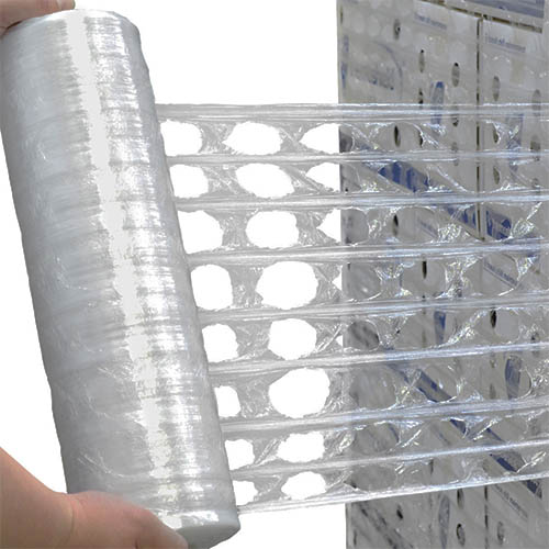 Stretch film netting provides ventilation while maintaining load security. It’s ideal for fresh produce, baked goods, or products requiring airflow, preventing condensation while keeping pallets stable and visible.
